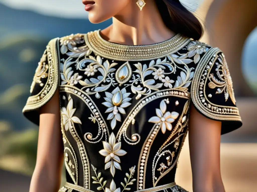 El uso de piedras preciosas y perlas en la alta costura no solo resalta la belleza de las prendas, sino que también preserva la tradición de la orfebrería y la joyería, fusionando el arte de la moda con la artesanía ancestral.